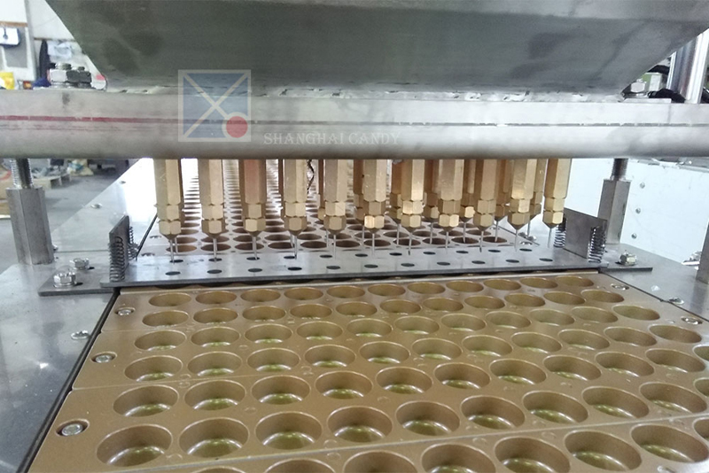 This machine is used to inject liquid chocolate into hollow biscuit. It mainly consists of machine frame, biscuit sourting hopper and bushes, injecting machine, moulds, conveyor, electrical box etc. The whole machine is made by stainless stainless 304 material, whole process is automatic controlled by Servo driver and PLC system.