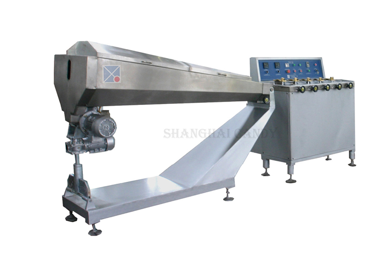 The line is composed of dissolving tank, storage tank, vacuum cooker, cooling table, batch roller, rope sizer, forming machine, transporting belt, cooling tunnel etc. The forming dies for hard candies are in a clamping style which is an ideal device for producing different shapes of hard candies and soft candies, small wastage and high production efficiency. The whole line is manufactured as per GMP standard in accordance with the requirement of GMP Food Industry.