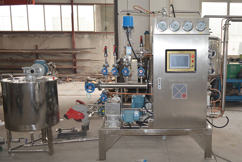 高速真空熬糖机由PLC控制系统、糖浆定量泵、薄膜蒸发器、真空式水环真空泵、卸料泵、温度压力等测量仪表及电器控制箱等部分组成,所有组成都安装在同一机架上,并通过各种管道阀门连接起来。该机组具有连续生产产量高、熬糖质量好、操作简便等特点,是理想的软糖熬糖设备。