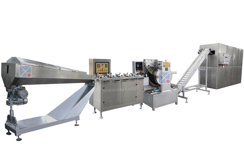 该生产线主要由真空熬糖机、保温辊床、匀条机、棒糖成型机、输送机、5层冷柜等组成。该生产线结构紧凑、占地面积小、性能可靠、废料少、生产效率高。整条生产线按标准制造,符合食品卫生要求。此生产线可添加连续薄膜熬糖机和冷却钢带实现全自动化生产。