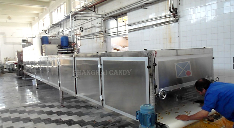 该生产线是目前国内生产太妃糖的设备。该生产线集机电于一体,采用硅胶模具,自动浇注,并通过自动跟踪传动系统脱模。可生产单色、双色、夹心和条纹太妃糖。整条生产线主要包括夹层锅、输送泵、预热锅、太妃专用熬糖机、浇注机、冷柜等。