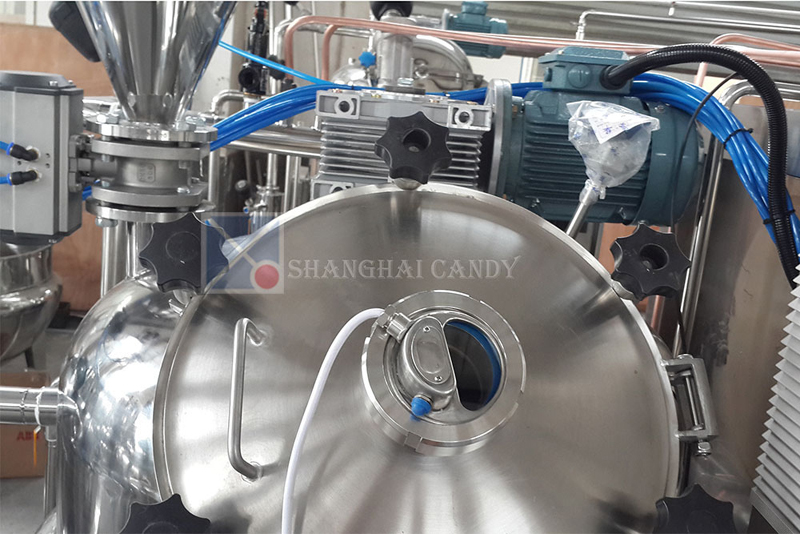 糖浆从化储存锅输送到熬糖机,通过旋转加热和均匀搅拌,熬成高质量太妃糖浆。当加热到一定温度,打开真空泵,辅助蒸发多余的水分。经过真空后,熬煮好的糖浆通过卸料泵输送出来。整个熬糖过程约35分钟(160L糖浆)。